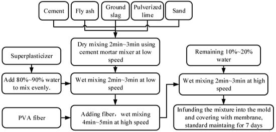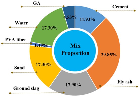 ECC used in this study was composed of cement, fly ash, ground slag, fine aggregate, polyvinyl alcohol (PVA) fiber, a water reducing agent, functional components and water in proportion. Among these components, P·II 42.5R cement produced by China cement plants, low calcium grade I fly ash produced by the Nanjing thermal power plant, S95 ground slag produced by Ma’anshan iron and steel Co., Ltd., Hunan, China, PVA fiber produced by Baohua Industrial Development Co., Ltd., Yongan, Fujian, China, polycarboxylate superplasticizer produced by Sika Corporation with 40% solid content and 40% water reduction rate were used. The maximum particle size of fine aggregates should be less than 1.18mm, the fineness modulus was 1.0, and the mass fraction of SiO2 should be over 99.5%. The mix component proportions of ECC are shown in Figure 1.