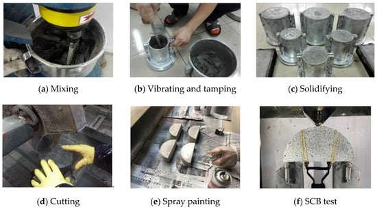 All the cylindrical specimens were demolded at the age of 24 h, and then cured at a relative humidity (RH) of 95 ± 5% and temperature of 20 °C until the age of 28 days. After curing, samples were cut into semi-circular geometry with 50 mm thickness for the SCB test, and spray painting was carried out for preparation of digital image correlation (DIC). All tests were carried out at the specimen age of 30 days. All the ECC SCB specimens were prepared according to the process shown in Figure 3.