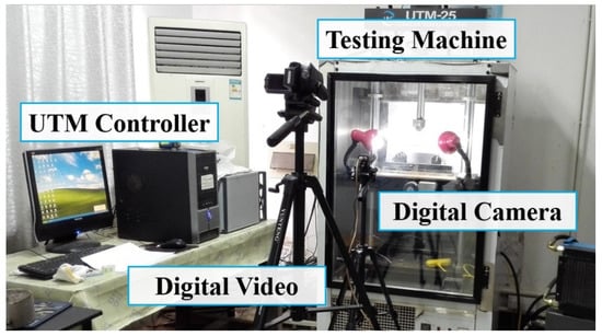Digital image correlation (DIC) technology was adopted to record the surface displacement and strain distribution of SCB specimens []. The experimental setups are shown in Figure 4. An industrial digital camera (resolution 1626 × 1236, focal length 25 mm, pixel size 4.4 µm, 14 fps @max resolution) was employed to capture frames during the process of fatigue loading. The camera was positioned perpendicular to a specimen and at a constant distance away from it. A lighting system, composed of two white lights, provided adequate illumination of the specimen inside the chamber. The camera was set to acquire five frames per second at the beginning of the test.