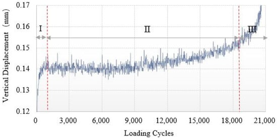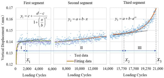 where, x is loading cycles, y is vertical displacement. a1, b1, c1, d1, a2, b2, a3, b3, c3 are model regression fitting parameters, K1, K2 and K3 are the slope of the three regression models respectively.