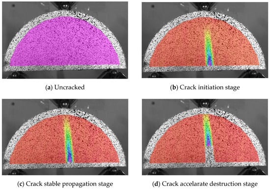 In order to more clearly observe the process of crack initiation and propagation and describe the strain distribution field of the specimen, digital image correlation (DIC) technology was adopted to analyze the strain distribution of the front face of the semi-circular specimen during fatigue process. The stages of crack initiation, propagation and accelerated destruction during the entire duration of the fatigue process can also be visualized using the DIC method. The transverse strain distribution fields at different stages of the fatigue process under stress ration 0.5 are shown in Figure 7. The strain distribution under other stress ratios are similar, and not discussed further in this paper.