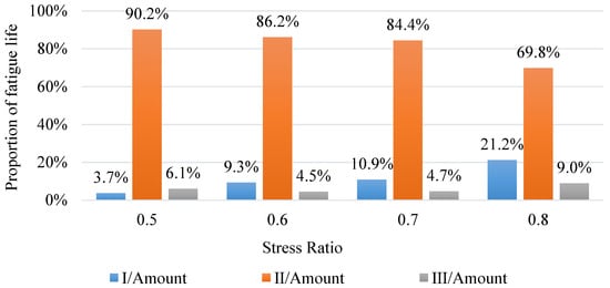 The results in Table 2 show that, with the increase of stress ratio, the loading cycles in each stage decreased gradually. Under the same stress ratio, the load cycles in stage II, that is, the crack stable propagation stage, were obviously greater than that of other stages. In order to better study the proportion of each stage over the whole fatigue life, the ratio of the load cycles in each stage to the total amount of loads cycles during the entire fatigue process was calculated as shown in Figure 8.