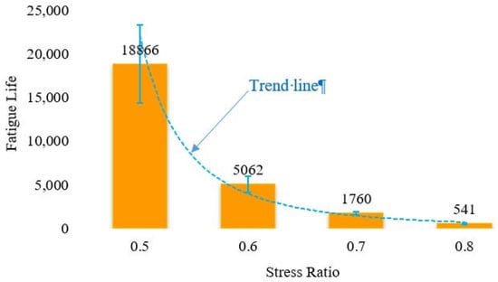 The fatigue life of ECC was determined to be the number of loading cycles at the end of stage II. During fatigue tests, four parallel tests were prepared and tested to obtain the fatigue lives of ECC under different stress ratios, as shown in Figure 9.