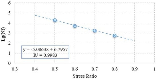 The fatigue life of ECC decreased significantly with the increase of stress ratio. Therefore, if ECC is applied to OSBD pavement, overloading will dramatically reduce the fatigue life of ECC pavement. According to the results shown in Figure 9, it can be found that there is a power function correlation between fatigue life and stress ratio. Thus, the fatigue life of ECC is transferred logarithmically to be . On this basis, the relationship between and stress ratio can be established and plotted, as shown in Figure 10.