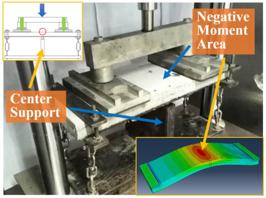 In order to overcome the disadvantages of existing OSBD pavement material composite beam fatigue tests, an improved three-point composite beam fatigue (ITBF) test was developed according to the actual working conditions of OSBD pavement []. Before testing, stress or strain fields in the specimen were calculated using the finite element method (FEM) and set to be consistent with the mechanical response of actual OSBD pavement by adjusting the test loading. UTM-25 was usually applied as loading equipment in this test, and the plane size of the specimens was 440 mm × 150 mm. During the loading process, two loading plates were used to simulate the wheel loads and the center support was adopted to simulate the OSBD stiffener. The mechanical analysis results show that this test could simulate the negative bending moment on the top surface of decks pavement under actual wheel load. The load transmission path and the stress distribution in this test are shown in Figure 11, which were highly consistent with the actual stress conditions of OSBD pavement. The specimen in the ITBF test was composed of a 25 mm thickness ECC layer and a 6mm thickness steel plate. Epoxy resin binder was used as the tack coat between ECC and steel.