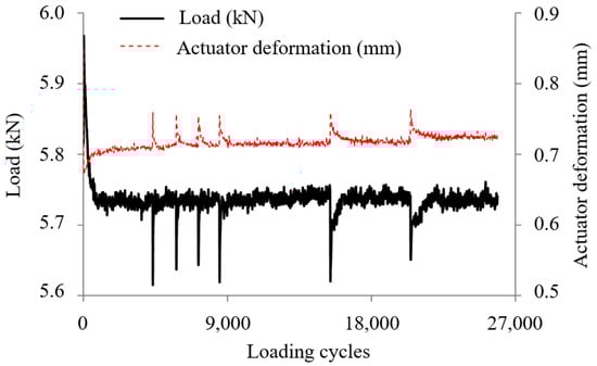In order to speed up the test process and avoid UTM equipment damaged by long-time working conditions, a stress ratio 0.5 of ECC was chosen during this test based on SCB fatigue test results. Under this status, the highest internal stress level of ECC in composite beam specimens was 5.48 MPa. According to the mechanical calculation results, the loading force should be 6.2 kN and the stress amplification factor was 2.96. Under this loading condition, the test load on ECC was equivalent to about 40 tons of axle load on actual OSBD pavement. The displacement curve obtained in the UTM controlling software interface during this test is shown as Figure 12.