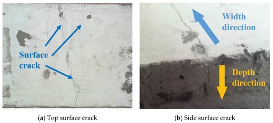 By observing the test results shown in Figure 12, it can be seen that many mutation points occurred on the displacement curve due to the crack propagation on the surface or inside of the ECC specimen. However, the displacement of the loading point quickly returned to the original level after mutation point. This phenomenon reflects that the only inorganic cement mastic may crack in ECC during this stage and the existence of PVA fibers enabled the ECC to bear loading after the cement mastic was damaged. Due to this characteristic, cracks propagated in the ECC, but the load-carrying capability was not significantly weakened. With the increase of loading cycles, cracking damage became more and more serious, but no sudden brittle fracture occurred. However, the bending and tensile capacities of ECC were further decreased and the loading point displacement increased slowly while cracks were propagating. The fatigue crack morphologies on the ECC specimen surfaces in a composite beam are shown in Figure 13.