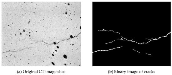 The digital image processing (DIP) technology was used to process the slice images of ECC obtained by CT scanning [], so as to identify the internal cracks and analyze the distribution of cracks. This study utilized image processing toolkit in MATLAB to process the obtained CT images. Crack recognition in CT images was realized by image enhancement, filtering, denoising, threshold segmentation and other technical means [,]. Specimens were scanned every 1 mm along the depth direction, and 26 images were obtained from top surface of the specimen to the bottom.