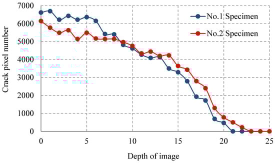 Crack pixel number variation along specimen depth direction.