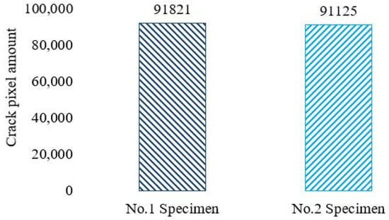 By comparing these two specimens, it could be seen that there were more cracks close to the top part of No. 1 specimen, while there were more cracks below a depth of 9 mm in the No. 2 specimen. By summing all the crack pixels in all of the image slices, the crack pixel amount in the No. 1 specimen was 91,821, while the amount in the No. 2 specimen was 91,125, as shown in Figure 18. These two values are very close, and the variation coefficient was only 0.538%. This phenomenon indicates that the fatigue test of the ECC pavement based on actual working conditions is reliable and effective. It is a scientific and reasonable technical means to identify cracks and analyze crack regions using DIP technology, and the crack image pixel statistical method was also a valuable way to evaluate the fatigue crack distribution in ECC.