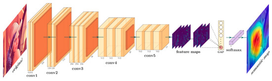 The semantic analysis network structure used in this paper is shown in Figure 2, using a classification-based training network architecture similar to Visual Geometry Group 16 (VGG16). The first five convolutional layers are used to extract the characteristics of the input image, and a global average pooling (GAP) layer is placed after the last convolution layer instead of the fully connected layer (FC) to convert the feature map into a feature vector. Compared to FC, GAP reduces a large number of network parameters, preventing over-fitting, and most importantly, GAP can save spatial information of images, which is significant to generate the semantic map. Finally, the weighted linear sum of the feature vector and its corresponding weight are input to the softmax layer to obtain the class activation map.