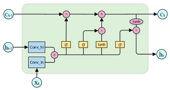 Each iteration unit contains convolutional units, LSTM units and a sub-pixel structure, which are used to extract image features, memorize the residuals in the iterative process, and restore the size of the image, respectively. The entire compression network uses eight recurrent neural networks composed of LSTM units (from A to H), which use the predicted output of the previous LSTM unit as inputs in a single iteration and transmit the hidden layer state parameter to the corresponding LSTM unit in the next iteration. The structure of the LSTM unit is shown in Figure 5, where and are the memory state and hidden layer state of the LSTM unit in the previous iteration, and is the input vector of the iteration, which is equal to the output of the upper layer network in this iteration. Each unit contains two convolutional neural networks; works on the input vector , and works on the hidden layer state of the LSTM unit in the previous iteration.