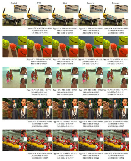 Figure 6 shows the original images and the results produced by the following compression methods. To ensure the compression ratio of each technique is as equal as possible, we maintain the bpp of the three compression methods at around 0.75; for an input RGB three-channel image, the compression ratio is close to 3 × (8/0.75) = 32 times. In the MS-SSIM indicator of the whole picture, the column of George’s method performed best, the method proposed in this paper performed less well, and the JPEG performed worst. At the same time, besides the structural similarity comparison of the whole picture, we also carried out subjective visual and objective numerical comparisons of the essential semantic areas in each image. As shown in Figure 6, the blue and green boxes are used to mark the characters and graphics on the plane, the text on the hat, the face, and the accessories on the body. All the grades of comparison in the MS-SSIM indicators show that our method gets the highest score. Moreover, in terms of visual quality, compared with the JPEG, with a visible blocking effect and artifacts through the contrast after magnification, and George’s method, with a noticeable blur in the details, our approach not only performs well in terms of sharpness and texture details but also avoids the blocking effect and artifacts that are common to JPEG methods.