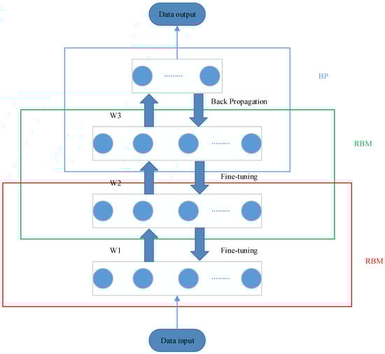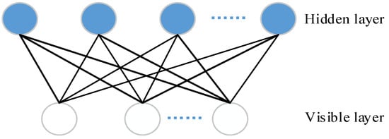 - DBN is a deep network efficient learning algorithm proposed by Hinton et al., with adaptive and self-learning capabilities, mainly used to deal with high-dimensional, large-scale data problems [33]. A DBN network consists of several layers of unsupervised restricted Boltzmann machine (RBM) and a supervised back-propagation (BP). RBM is a probability graph model consisting of visible layers and hidden layers, two layers of neurons are connected by weights. In general, visible layer units are used to describe the characteristics of data, while hidden layer units can be regarded as feature extraction layers. The structure of the RBM is shown in Figure 1.