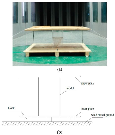 Layout of testing model. (a) Testing model in the wind tunnel; (b) the drawing of the testing model.