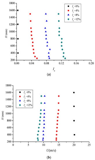 By adjusting the spires and grids in the wind tunnel, three turbulent flows, which are nominally 4%, 8% and 12%, were generated. The turbulent intensity Iu and average wind speed U of the four flow fields simulated by the wind tunnel are shown in Figure 2, in which H is defined as the vertical height above the wind tunnel ground. It was found that the smooth flow and the three turbulent flow fields are well simulated in the wind tunnel.