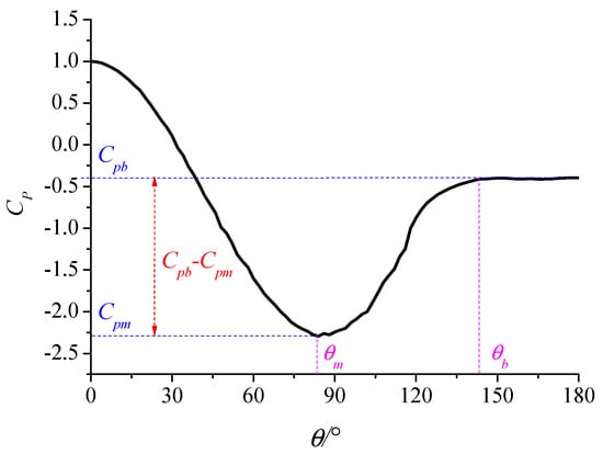 Similarly to the previous research, the characteristic parameters of mean wind pressure distribution on the smooth cylindrical surface will be discussed in this paper and are shown in Figure 3. Cpm is the minimum wind pressure coefficient on the surface of circular cylinder and θm is the angular position of the minimum wind pressure coefficient. Cpb is the mean wind pressure coefficient within the base region of the circular cylinder and θb is the angular position where the base region starts. The wind pressure rise coefficient Cpb − Cpm is defined as the difference between the mean wind pressure coefficient in the base region and the minimum wind pressure coefficient.