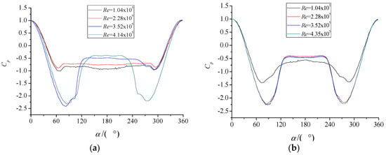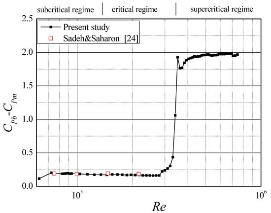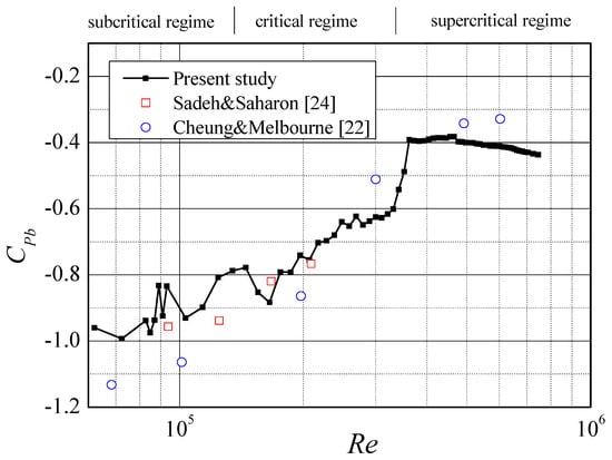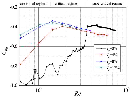 Figure 4 shows Cpb at different Reynolds numbers in the smooth flow. When the Reynolds number is in the subcritical regime, Cpb increases slowly with a higher Reynolds number. When the Reynolds number is in the critical regime, Cpb increases rapidly, which indicates that the flow on both sides of the circular cylinder changes from laminar to turbulent separation. When the Reynolds number is in the supercritical regime, Cpb is basically near −0.4 due to the complete turbulent separation on both sides of the circular cylinder, exhibiting a slight decrease. They are consistent with the results of Sadeh and Saharon [24] in the subcritical regime; the varying trend in the measured Reynolds number regime is consistent with Cheung and Melbourne [22].
