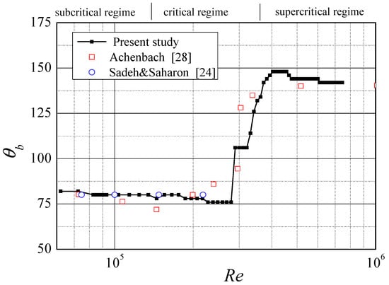 Figure 5 shows the position of the separation point θb at different Reynolds numbers in the smooth flow. When the Reynolds number is in the subcritical regime, θb is basically around 80°. When the Reynolds number is in the critical regime, θb increases rapidly, indicating that turbulent separation causes the separation point to move backwards, with the angular position close to 160°. When the Reynolds number is in the supercritical regime, θb falls back to 142°–144°. The experimental results in this paper are basically consistent with the results of Achenbach [28] and Sadeh and Saharon [24] in the measured Reynolds number regime.