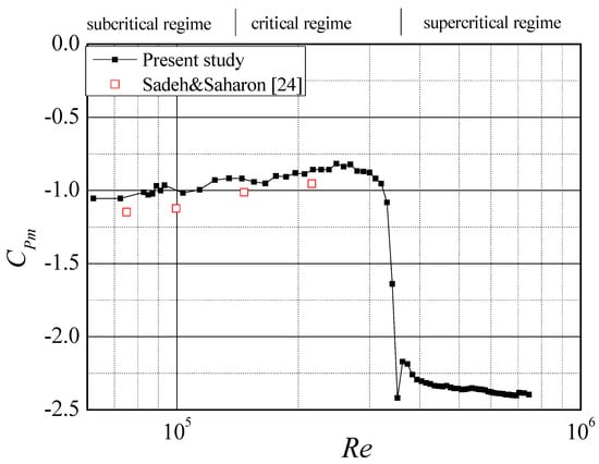 Figure 6 shows the minimum wind pressure coefficient Cpm at different Reynolds numbers in the smooth flow. When the Reynolds number is in the subcritical regime, Cpm increases slowly from less than −1.0 to greater than −1.0 as the Reynolds number increases. When the Reynolds number is in the critical regime, Cpm rapidly decreases to −2.4. When the Reynolds number is in the supercritical regime, Cpm decreases slightly due to the completely turbulent separation on both sides of the circular cylinder. As with Cpb, the results in the subcritical regime are basically consistent with the results of Sadeh and Saharon [24].