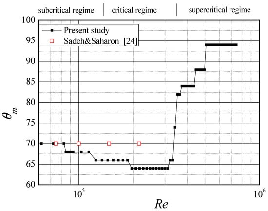 Figure 7 is the position of the minimum wind pressure coefficient θm at different Reynolds numbers in the smooth flow. When the Reynolds number is in the subcritical regime, θm slowly decreases from 70° to about 64° as the Reynolds number increases. When the Reynolds number is in the critical regime, θm increases rapidly and the minimum wind pressure coefficient Cpm appears at an approximate angle of 84°. When the Reynolds number is in the supercritical regime, θm slowly increases to about 94°. In the subcritical regime, θm obtained in this paper is less than that obtained by Sadeh and Saharon [24], indicating that the measured minimum wind pressure coefficient in this paper appears at a more forward angular position of the circular cylinder.