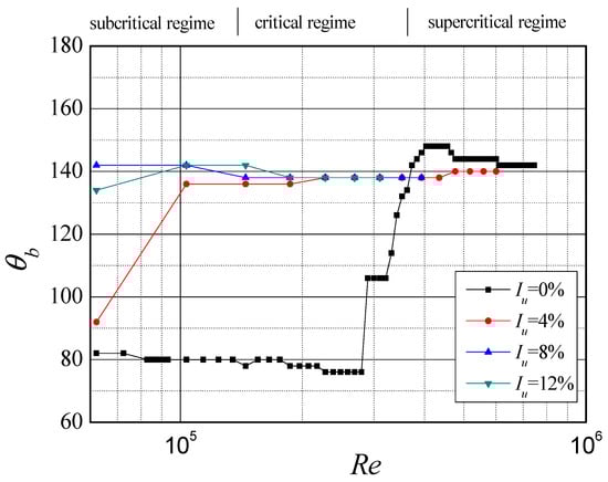Figure 10 shows θb for different turbulence intensities and Reynolds numbers. In the smooth flow, θb is about 80° in the subcritical regime, suddenly moves backwards in the critical regime and it is basically stable at 140° in the supercritical regime. In the turbulent flow, θb is about 140° in the measured Reynolds number regime and is independent of the turbulence intensity. When the Reynolds number is in the supercritical regime, θb in the smooth flow and the turbulent flows are both approximately 140°—that is, in the supercritical regime. The position of the flow separation point is then basically independent of the flow state.