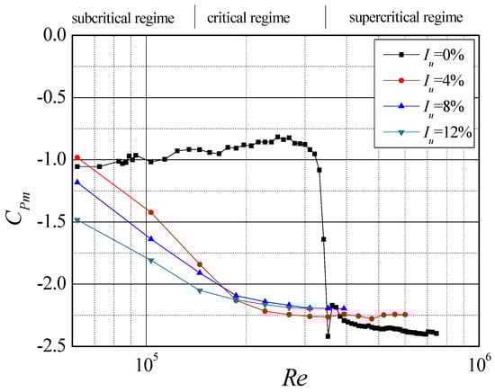 Figure 11 shows Cpm for different turbulence intensities and Reynolds numbers. In the smooth flow, Cpm is almost unchanged in the subcritical regime and suddenly decreases in the critical regime. However, it changes little in the supercritical regime. In the turbulent flow, when the Reynolds number is less than 2 × 105, Cpm decreases with the increasing Reynolds number and decreases with stronger turbulence intensity at the same Reynolds number. When the Reynolds number is larger than 2 × 105, Cpm has very minor changes. When the Reynolds number is greater than 3.3 × 105, Cpm is basically unchanged and is close to the value in the smooth flow.