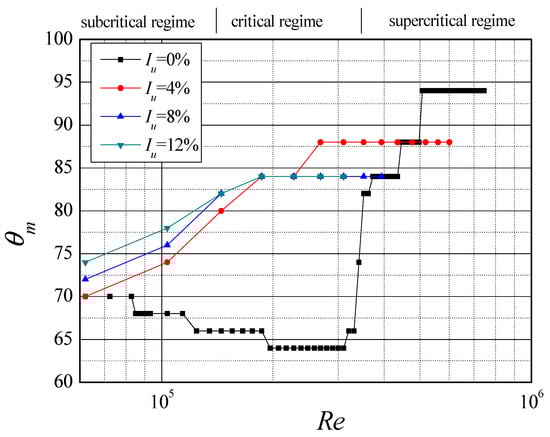Figure 12 is θm for different turbulence intensities and Reynolds numbers. In the subcritical regime, turbulence leads to an increase of θm. In every turbulent flow in this paper, within the regime of measured Reynolds number, θm is basically unchanged when the Reynolds number reaches a certain value—such as 1.9 × 105—in turbulent flows of 8% and 12%. There is a significant difference in θm when the Reynolds number is between 1 × 105 and 3 × 105.