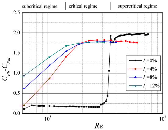 Figure 13 shows the wind pressure rise coefficient Cpb-Cpm for different turbulence intensities. Cpb-Cpm in the subcritical regime is stable at about 0.2 in the smooth flow, but sharply increases in the critical regime. For different turbulent flows, Cpb-Cpm increases with the increasing turbulence intensity at the same Reynolds number. When the Reynolds number is in the critical regime, Cpb-Cpm increases suddenly in the smooth flow, which does not happen in the turbulent flows. There is a significant difference about Cpb-Cpm in smooth and turbulent flows. In the supercritical regime, Cpb-Cpm is basically stable at 2.0 in the smooth flow and 1.75 in the turbulent flow.