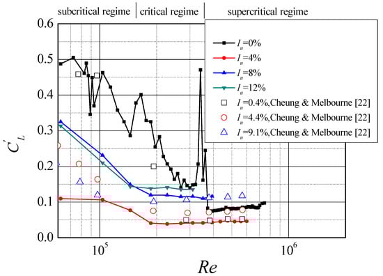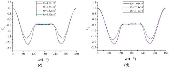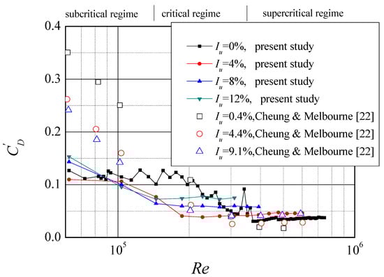 The standard deviations of the drag coefficient of the smooth circular cylinder for different turbulence intensities and Reynolds numbers are shown in Figure 17. In different turbulent flow, decreases with the increase in Reynolds number, which is consistent with the results obtained by Cheung and Melbourne [22]. In the smooth flow, there is a sudden change in at Re = 3.5 × 105 because there is no simultaneous transition of laminar separation to turbulent separation on both sides of the circular cylinder. When Re = 1 × 105–2.7 × 105, in the smooth flow is generally larger than that in the turbulent flow, consistent with the results of Cheung and Melbourne [22]. In different turbulent flows, is basically unchanged when Re > 4.0 × 105 and the values are close, consistent with the results of Cheung and Melbourne [22].