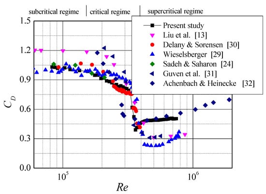 Figure 15 shows the mean drag coefficient CD of the circular cylinder in the smooth flow as well as the results of previous studies. When the Reynolds number is less than 1.0 × 105, CD is basically unchanged; CD then decreases with the increase of the Reynolds number. When the Reynolds number is between 3.0 × 105 and 3.6 × 105, CD decreases rapidly, then increases gradually when the Reynolds number is between 3.6 × 105 and 4.0 × 105. When the Reynolds number is between 5.0 × 105–8.0 × 105, CD gradually becomes stable. The test results in this paper are closer to those obtained by Wieselsberger [29], Delany and Sorensen [30] and Sadeh and Saharon [24] when the Reynolds number is less than 2.0 × 105, and smaller than the results obtained by Liu et al. [13]. When the Reynolds number is between 2.0 × 105 and 3.0 × 105, the test results in this paper are smaller than the results obtained by Wieselsberger [29], Güven et al. [31] and Liu et al. [13]. In the region of rapid decline in the drag coefficient, the results are very close to other results. When the Reynolds number is greater than 4.0 × 105, the test results are greater than the results obtained by Wieselsberger [29], Güven et al. [31] and Liu et al. [13]; however, it is closer to the result obtained by Achenbach and Heinecke [32].