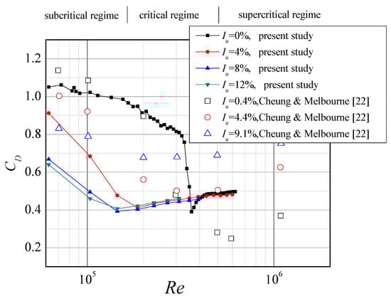 The drag coefficients CD of the smooth circular cylinder with a Reynolds number for different turbulence intensities and Reynolds numbers are shown in Figure 16 and the results were compared with those obtained by Cheung and Melbourne [22]. In the three different turbulent flows, the critical Reynolds number moves to a smaller Reynolds number and the critical regime of the Reynolds number is inconspicuous compared to that number in the smooth flow. This is consistent with the result of Cheung and Melbourne [22]. In the supercritical regime, the influence of turbulence intensity on CD of the circular cylinder is not obvious and CD is basically the same in the four different flows, all of which are approximately 0.5. In the smooth flow, the results in this paper are close to those obtained by Cheung and Melbourne [22]. In the subcritical and critical regimes, however, the results in supercritical are larger than those obtained by Cheung and Melbourne [22]. In the case of similar turbulence, the test results in this paper are slightly smaller than those obtained by Cheung and Melbourne [22], but the varying trends with the Reynolds number are consistent.