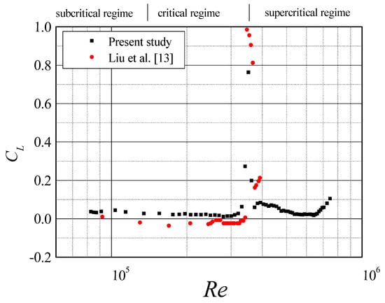 Figure 18 shows the mean lift coefficient CL of the circular cylinder in the smooth flow. It can be seen that, in general, CL is almost in the vicinity of 0 in the measured Reynolds number regime, which is in accordance with the force characteristics of the circular cylinder. However, when Re = 3.52 × 105, CL sharply increases to 0.76 because there is no simultaneous transition of laminar separation to turbulent separation on both sides of the circular cylinder. The test results in this paper are close to those of Liu et al. [13]; CL in both sharply increases near Re = 3.5 × 105.