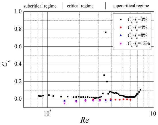 The lift coefficients CL of the smooth circular cylinder for different turbulence intensity and Reynolds numbers are shown in Figure 19. CL values of the three turbulent flows are all near zero, indicating that the wind field is symmetrically distributed. Being different from the sudden change of CL in the smooth flow in the critical regime, there is no obvious sudden change in CL in the critical regime in the turbulent flow.
