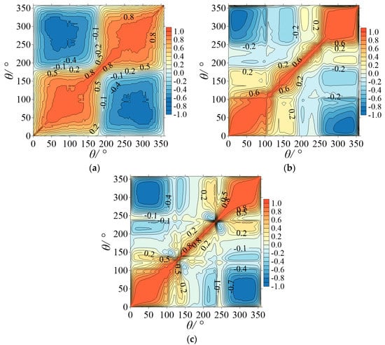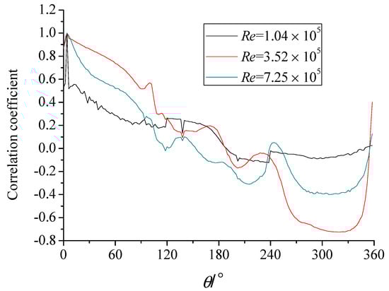 In the smooth flow, the wind pressure distribution in different Reynolds number regimes is different and the correlation of the wind pressure coefficient is different. The correlation of the wind pressure coefficient with each other at three typical Reynolds numbers is plotted in Figure 22. When the Reynolds number is in the subcritical regime (Re = 1.04 × 105), the wind pressure on the same side has a strong positive correlation and the wind pressure has a strong negative correlation between the two sides. When the Reynolds number is in the critical regime (Re = 3.52 × 105), one side has laminar separation while the other side has turbulent separation; wind pressures in the region of about 0°–120° and 120°–180° on the same side have strong correlations but the correlation between the two regions is weak. However, the correlation between the region of about 120°–180° and 180°–210° is relatively weak. When the Reynolds number is in the supercritical regime (Re = 7.25 × 105), the wind pressure correlation is strong before the separation point and the correlation at other locations is weak. The correlation of the wind pressure in the region before the separation point is stronger on the same side and the correlation of the wind pressure in the region after the separation point is weaker. Overall, the correlation on the same side is generally strong at the three wind speeds, while the two sides of the circular cylinder show a significantly negative correlation.