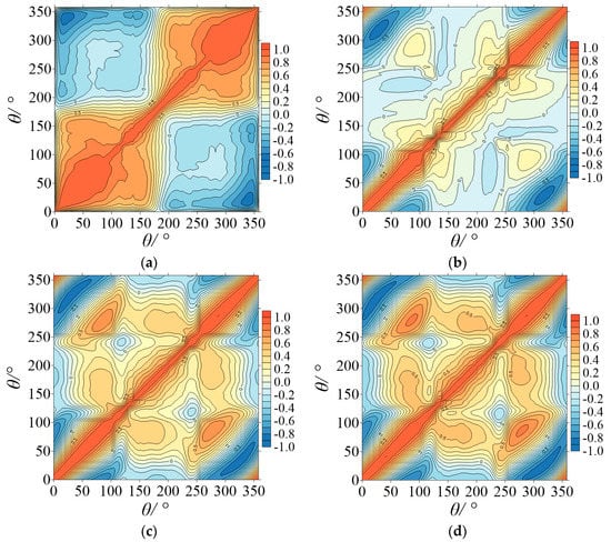 The distribution of wind pressure coefficients in different turbulent flows is different and the correlation of wind pressure coefficients is also different. The correlation of wind pressure coefficients of four turbulence degrees at Re = 3.11 × 105 is shown in Figure 23. In the smooth flow, the wind pressure on the same side of the cylinder shows a strong positive correlation and the wind pressure shows a strong negative correlation between the two sides. When Iu = 4%, the correlation of wind pressure between adjacent points is still strong but the correlation of wind pressure between the distant points drops sharply. Compared with the correlation of wind pressure when Iu = 4%, the correlation of wind pressure between the points on the base region is much stronger when Iu = 8% and 12%. In general, turbulence will weaken the positive correlation of the same side and also reduce the negative correlation between the two sides of the circular cylinder.