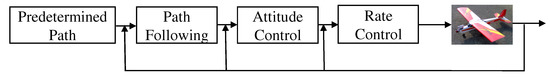 In this research, guidance commands for the UAV orientation are generated using carrot chasing and PLOS with a receding virtual waypoint. The UAV can alter its heading by changing the attitude. The nonlinear flight control system shown in Figure 1 highlights the sequence of generating physical control surface commands starting with a predefined path, followed by generating the desired guidance command. The control law is designed based on the two-timescale separation concept, which is discussed in the following [17].