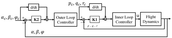 NLDI is a control strategy that uses the model of a system to control it and through that eliminates the need for gain scheduling and improves performance. Consequently, NLDI controller is used for achieving high maneuverability associated with a high level of accuracy [6]. The attitude control is generally conducted using two loops: the first rotation control loop for fast-timescale state dynamics, and attitude control loop for slow-timescale state dynamics. The two-timescale NLDI approach used to achieve the desired angle of attack, side-slip angle and the desired bank angle are shown in Figure 3, which reduces the controller order to simplify the design process [20].