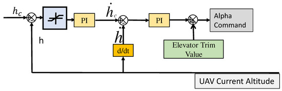 The altitude control loop equation is given in Equation (26) shows that the UAV altitude is controlled by executing a certain angle of attack. The error between the desired altitude and current altitude is controlled using PI controller.