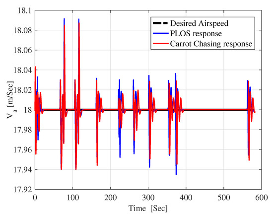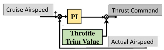 For strengthening the path-following ability of a UAV to keep tracking the desired position along the given required path, the UAV velocity holding must be taken into consideration. Applying a PI controller for the velocity error to get the desired thrust command given in Equation (27), the gains of PI controller are selected by trial and error to fulfill the accepted holding cruise speed, as illustrated in Figure 5.