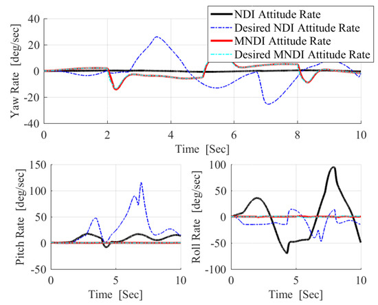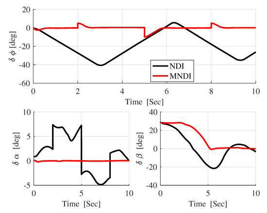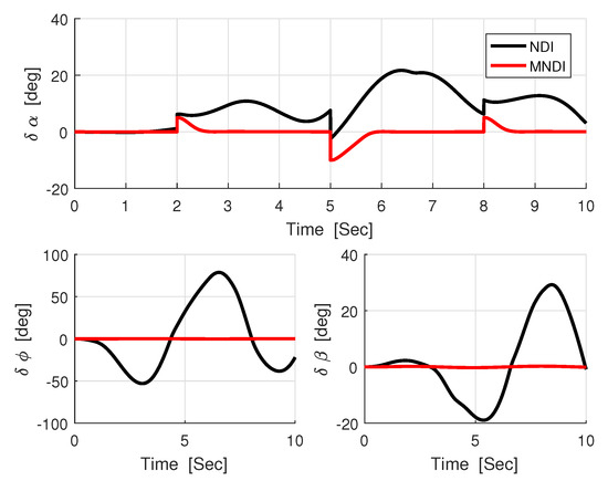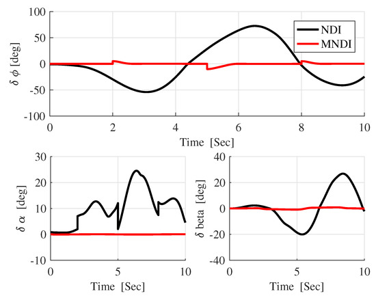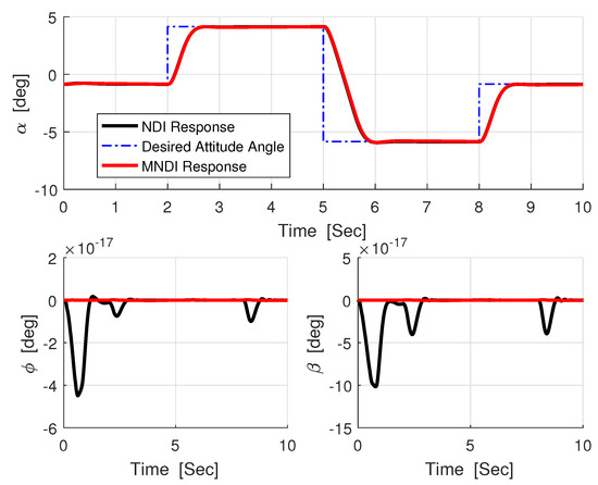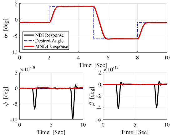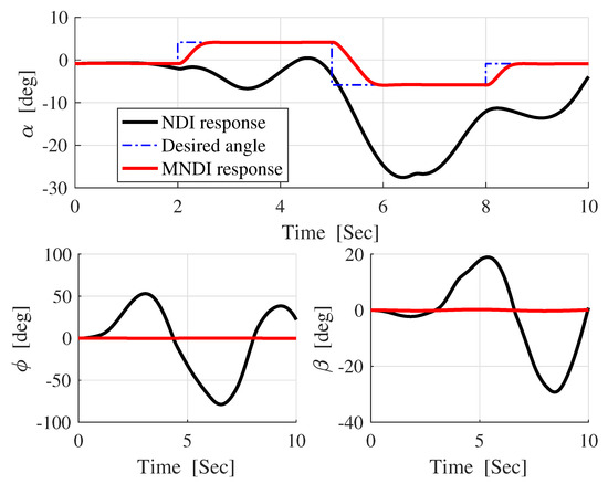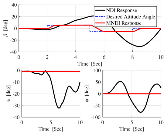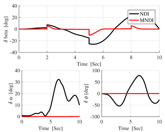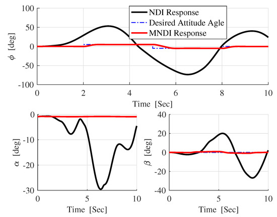 In Figure 13, the difference between the desired attitude angle and the actual response of both flight controller confirms that MNLDI is more robust against than NLDI.