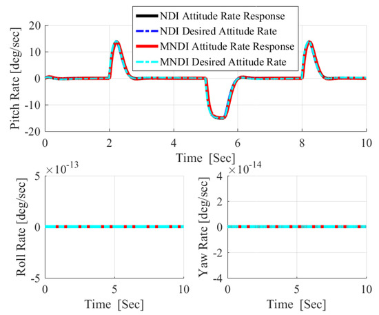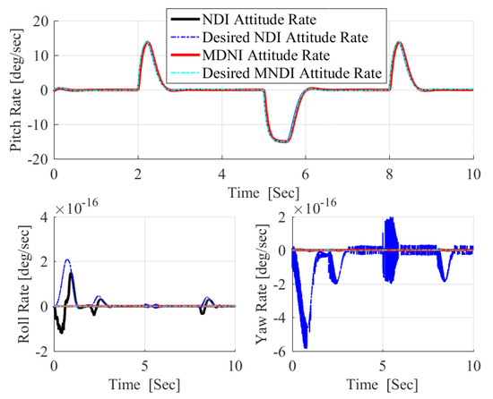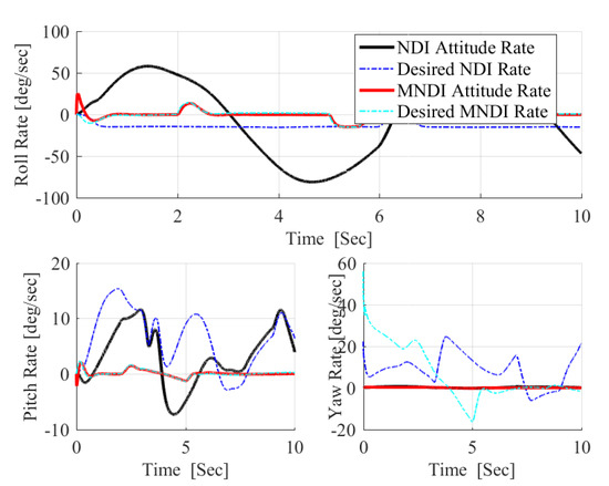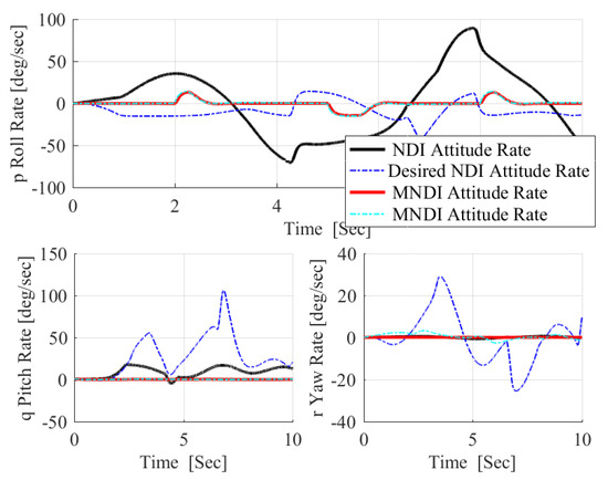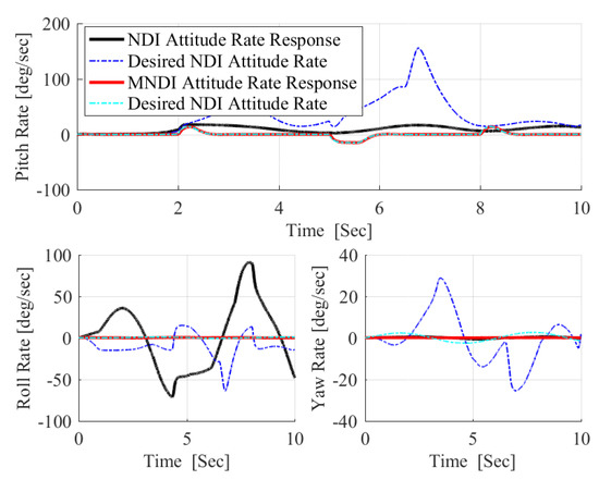 The most important shortcoming associated with NLDI approach is the vulnerability to any uncertainties as it is a model-dependent control method, while MNLDI is robust against any model uncertainties as it is a model-independent flight control concept. Figure 11 shows the effect of the uncertain aerodynamic model given in Figure 10 in the performance of NLDI and MNLDI flight controller. NLDI is sensitive to the uncertainties; therefore, it is unable to track the desired references which confirms that the NLDI flight controller must be augmented with any other robust flight controller. In contrast, MNLDI is robust against model uncertainties; moreover, it still has absolute decoupling between roll and yaw angles. As a result, practically using MNLDI as a stand-alone flight control system is preferable. In Figure 12, the high amplitude angular rates performed by NLDI confirms the internal instability of using NLDI under model uncertainties. Meanwhile, MNLDI is still internally stable, as the angular rates required for achieving a sharp pitch maneuvers are within the allowable limits of angular rates.