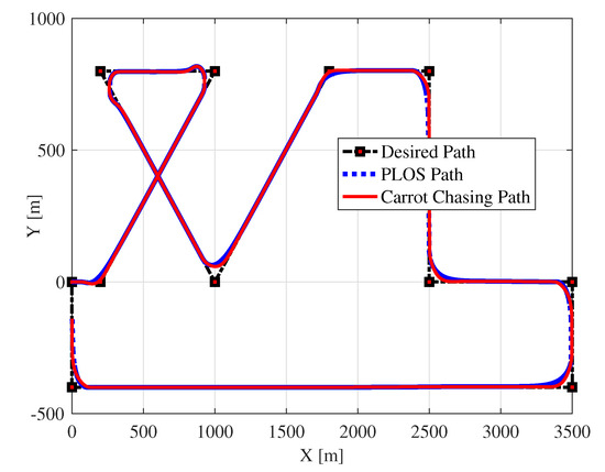 Diverse path following algorithms have been successively implemented for real flight tests. There are two categories for path following algorithms, one is based on control theories while the other is based on a geometric interpretation [4,5]. Path following based on the geometric techniques generates guidance command based on the graphical derivation of the desired law. Geometric algorithms are easy for implementation and simple for understanding rather than the control techniques. It includes the pure pursuit guidance law [6], Line of Sight (LOS) guidance law [7], Nonlinear Guidance Law (NLGL) [8], Vector Field-based path following (VF) [1], and carrot chasing path following algorithm [9,10]. In most cases, as used in this paper, a combination of the pure pursuit guidance law and the LOS guidance law are considered. On the other hand, path following based on control techniques are common in applications because it guarantees system robustness to wind disturbances. A common control path following algorithm is based on proportional-integral-derivative (PID) control [11]. Rhee and Park [12] proposed a modified PID controller with feedforward ability to improve the performance of path following. Gain scheduling approach is also used for trajectory tracking by generating integrated guidance and control algorithms for autonomous vehicles [13]. Linear Quadratic Regulator based path following (LQR) [14] is also a well-known control technique used for UAV path following.