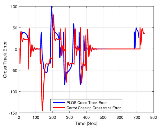 Cross track error associated with both path following methods with wind.