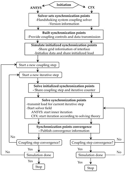 In view of the interaction between the impeller structure and flow fields, bidirectional FSI was applied to the simulations. Here, data are transferred between computational fluid X (CFX) and the structure analysis module on an interface through the ANSYS multi-field Solver (MFS). The flow field pressure distribution in the whole flow system of the axial-flow pump are obtained by CFX, and then the pressure values on the blade are delivered to the structure analysis module to solve the displacement and deformation. The corresponding feedback of deformation on the flow field can be updated again through CFX. The moment of data exchange between flow fields and structure fields is called the synchronization point, except for data which cannot be transmitted. Figure 1 shows the fundamental principle.