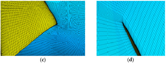 Grid of fluid calculation domain, (a) the whole calculation domain, (b) the main overflow components, (c) the root of the blade’s leading edge, and (d) the top of the blade’s leading edge.