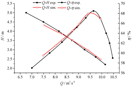 To verify the accuracy and reliability of the numerical simulation, some characteristic parameters—i.e., flow rate Q, head H and efficiency η—are compared with prototype experimental data in Figure 4. The calculated values of Q, H and η were in good accordance with the test values within a 3% error, which verifies that the numerical calculation models and methods applied in this paper could truly reflect the characteristics of this axial-flow pump. The following study on the dynamic stress characteristics of axial-flow pumps can be forecasted accurately.