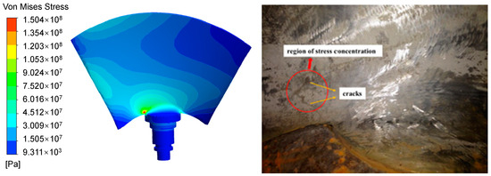 Figure 8a shows the equivalent stress of the suction side of the impeller blade at φ = 0°, and a stress concentration region is found near the root and leading edge. This is consistent with the crack areas on the prototype blade, as shown in Figure 8b. This means the cracks may be influenced and caused by the high equivalent stress and stress concentration.