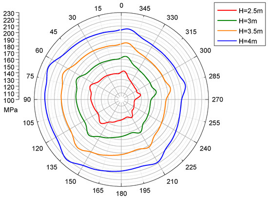 Figure 9 provides the changing rule of the maximum dynamic stress of blades within a spatial rotation cycle under different working conditions. Considering the influence of gravity, the maximum dynamic stress of the blade first increases and then decreases in an anticlockwise rotation cycle. The maximum equivalent stress appears at φ = 66° and is 150.25 MPa and 173.14 MPa under H = 2.5 m and H = 3 m working conditions, respectively. Under H = 3.5 m and H = 4 m working conditions, the maximum equivalent stress appears at φ = 140° and is 197.21 and 221.37 MPa, respectively; thus, the higher a head is, the greater its maximum dynamic stress would be. Meanwhile, the maximum dynamic stress of blades all appear on the suction surface near the leading edge of the blades and the root.
