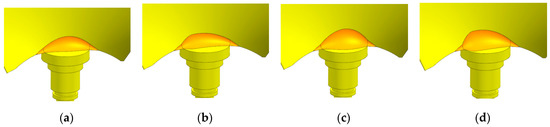Finite element model of blades with four different root thicknesses: (a) Model 1, (b) Model 2, (c) Model 3, and (d) Model 4.